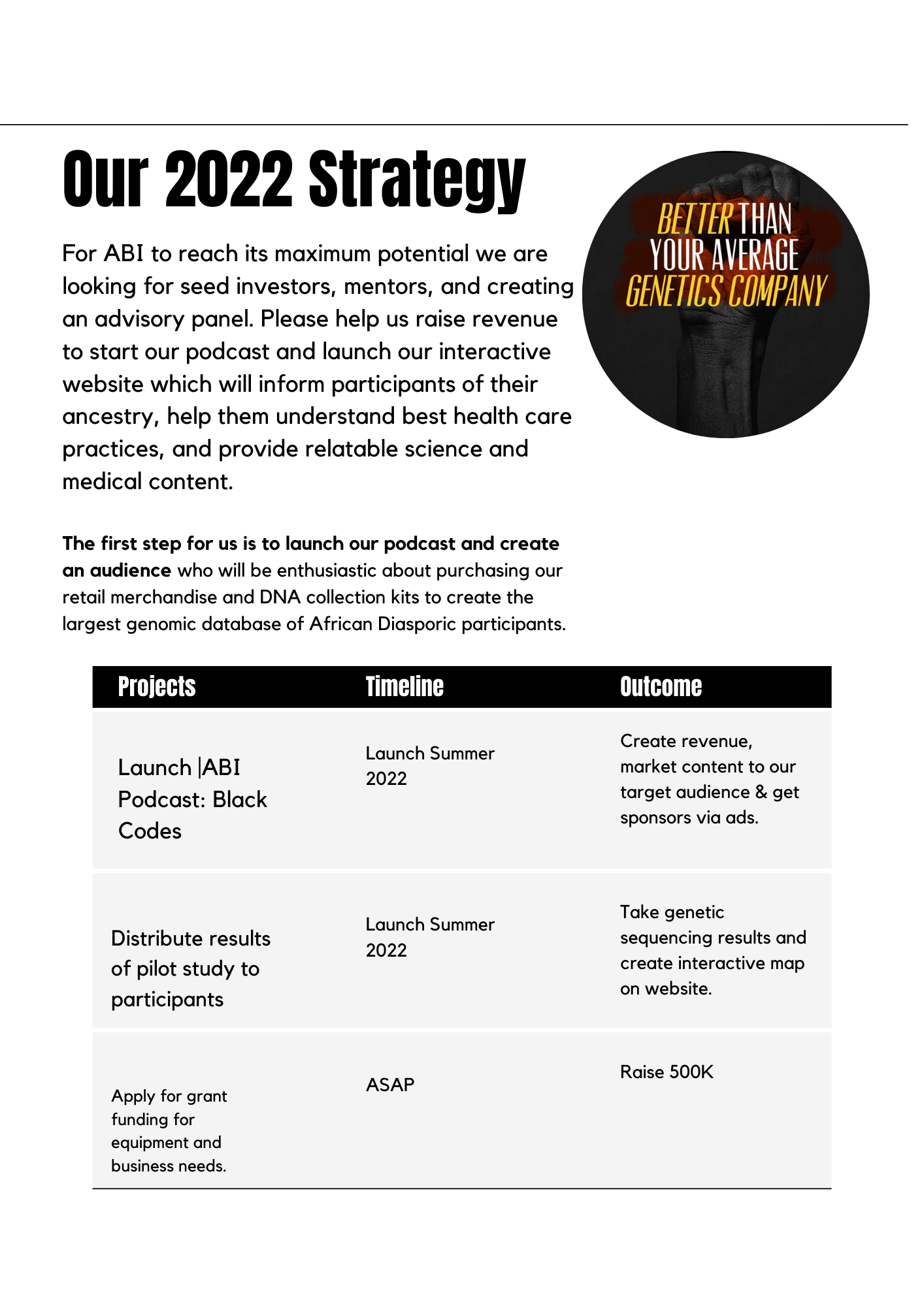 This year we are dedicated to securing a major grant that will provide us with equipment and office space, and continue building our database. Check out our executive summary below. If you are interested in sponsoring The ABI Podcast; Black Codes with ads from your business please contact us asap.